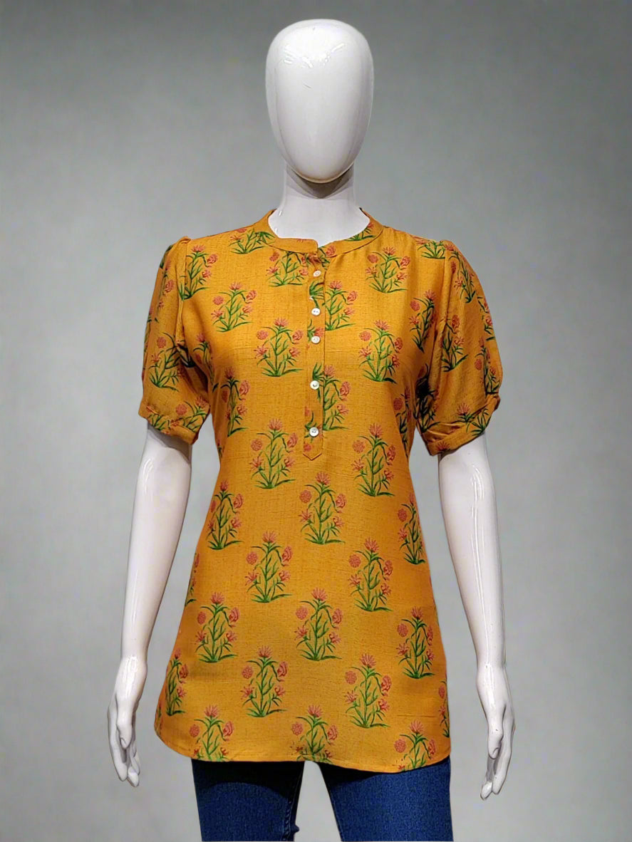 Made with soft, breathable cotton fabric, this kurti features a vibrant floral print and stylish short sleeves for a breezy, comfortable fit.