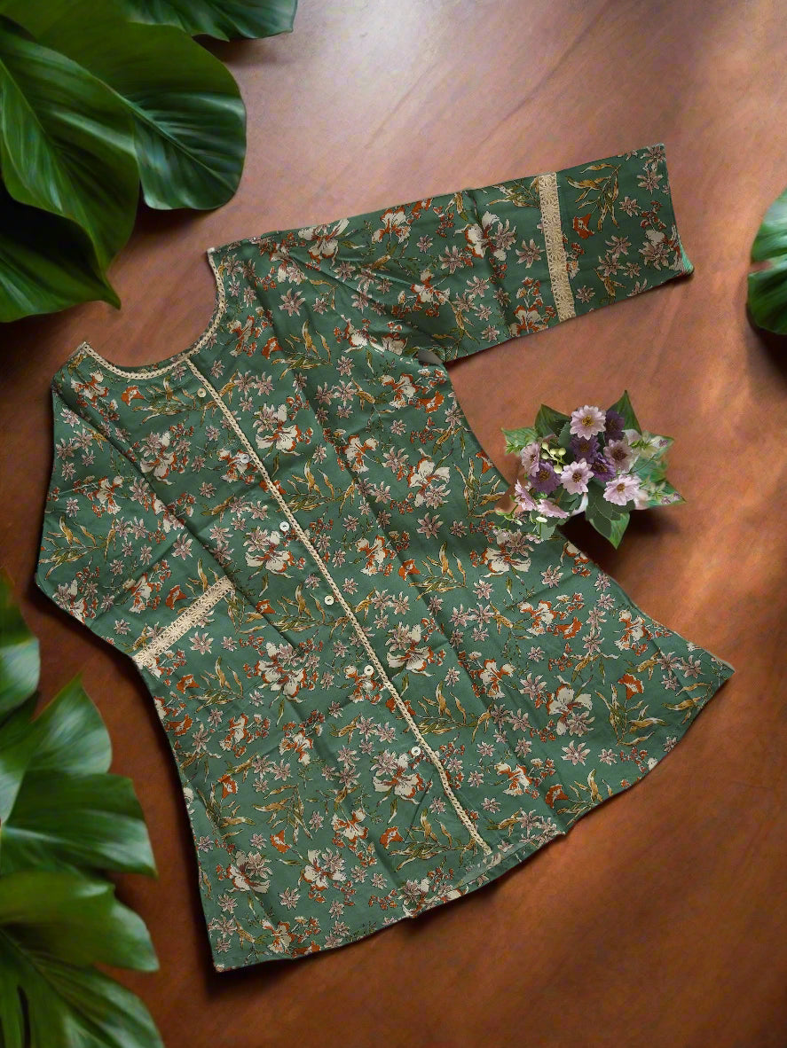 Sage Green Floral Cotton Kurti featuring a soothing green base with delicate floral prints and intricate lace detailing