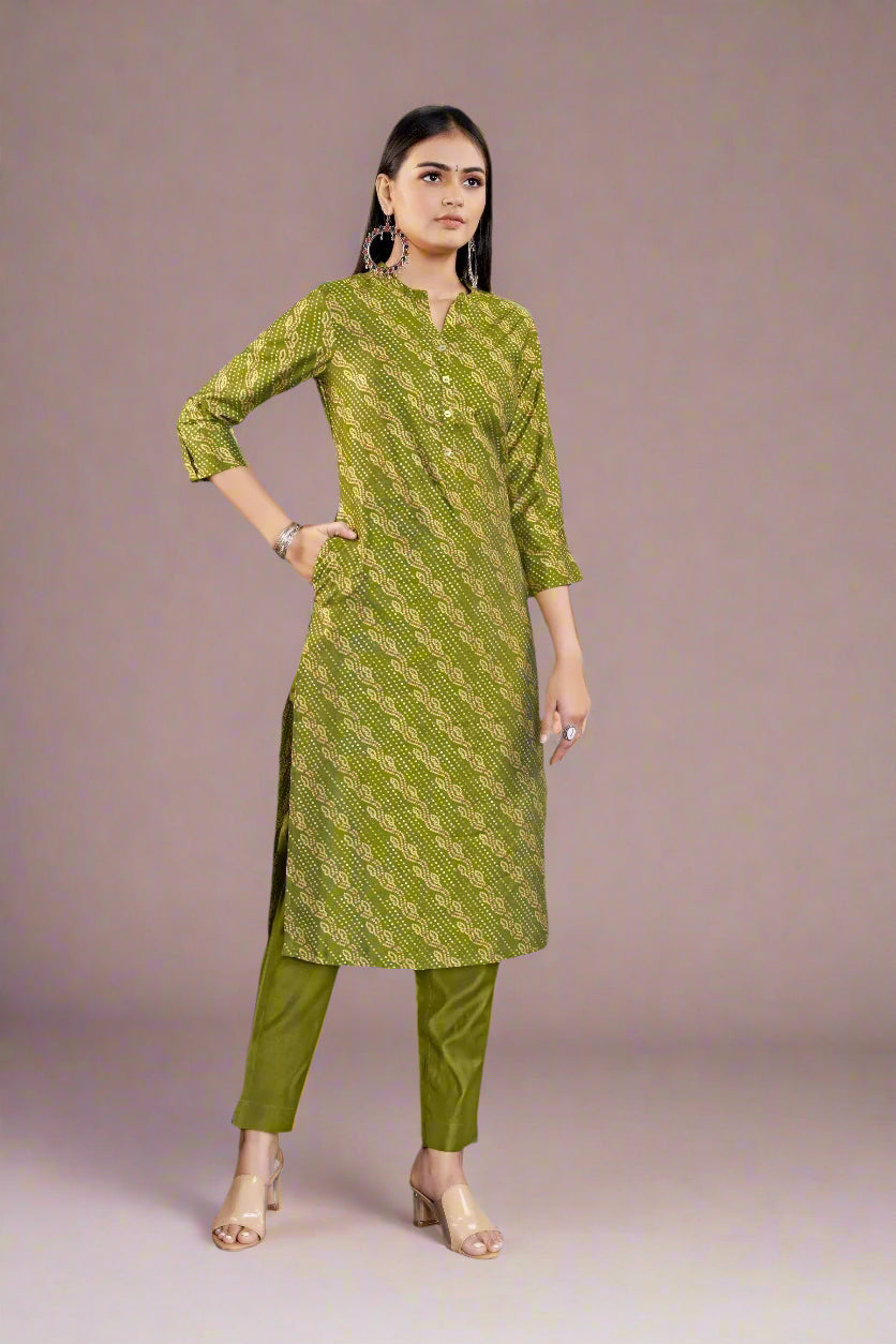 Crafted in soft and breathable bamboo silk, the kurta features a graceful notched V-neckline with subtle button detailing, paired with a sleek matching pant. Lightweight, comfortable, and stylish