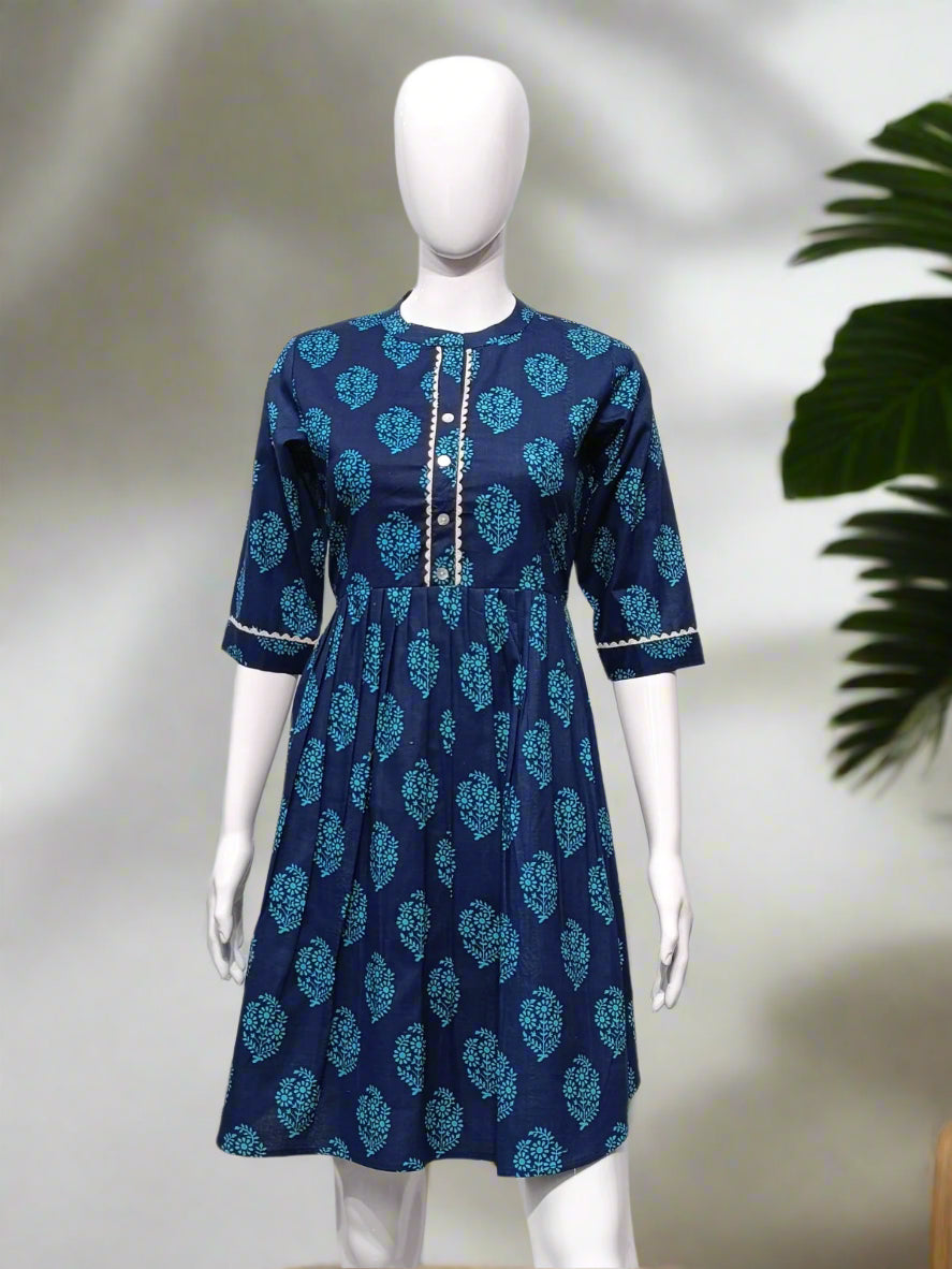 Navy Blue Khadi Cotton Anarkali Kurti with Teal Floral Print