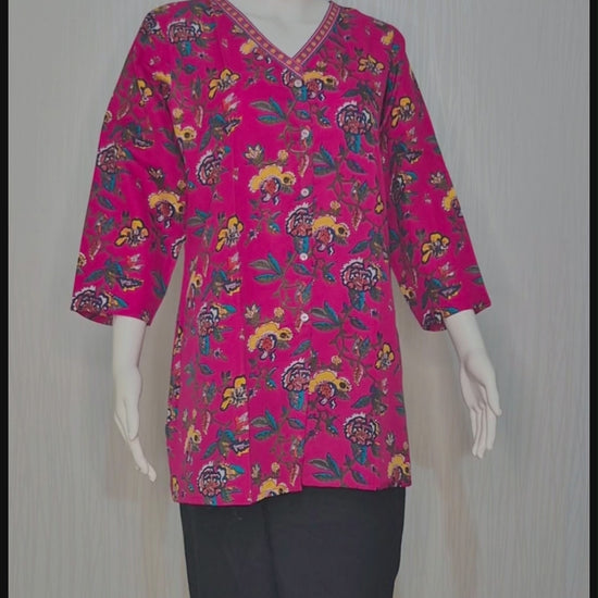 Pink floral kurti crafted from soft and breathable poly-cotton fabric. Designed with a flattering V-neckline, front button detailing, and comfortable 3/4th sleeves, this short kurti offers a perfect mix of style and ease for office wear, casual outings, and daily dressing.